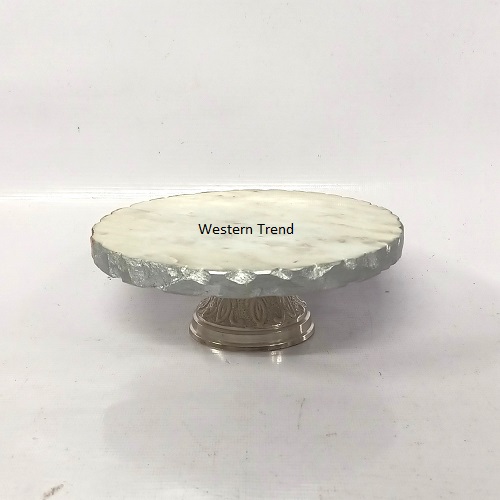 Present Your Cakes in Style With This Rough Edge With Handmade Textured Work With Silver Finish Marble Cake Stand, Premium Marble Top Enhance the visual appeal of your cakes with the classic charm of marble, Round White Marble Cake Stand With Metal Silver Base, Stylish and Sturdy Showcase your Delicious Creations With Grace Metal Stand, Elegant Cake stand, Versatile Display Perfect for Cakes, Pasties, cupcakes, and gifts Birthday gift, Hamper gifts, Wedding gifts, Anniversaries gifts, Festival Gifts, Occasion Gifts, Diwali Gifts, Corporates Gifts, Latest Designer Gifts, Luxury Gifts, Royal Gifts, Exclusive Gifts, Handicrafts Gifts, Table top Products, Beautiful Centerpieces Elevate Your Table Decor With This Eye Catching Cake Stand, The Cake Stand are professionally crafted in high quality marble to make the tables sturdy and durable to stand the test of time its Designed By Western Trend