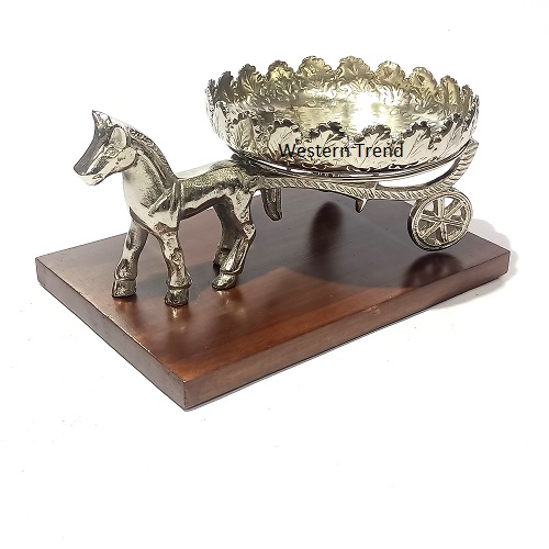 piece is a handcrafted silver-plated horse chariot bowl set on a rich wooden