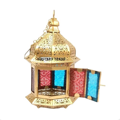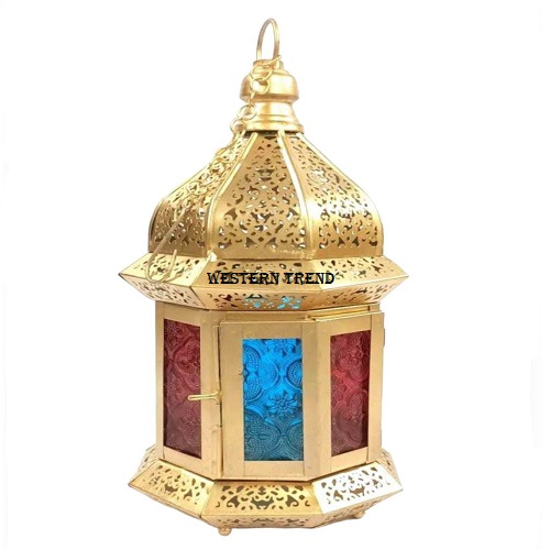 This gorgeous, beautifully crafted decorative iron hanging lantern with brass plating gives a royal look and feel to your home and garden. Easily place the candle by opening a small door in the front. Perfect for self-use and gift items for special occasions, A unique design Moroccan lanterns for tables and corners. Heavily detailed, with textured filigree metal frame, it's suited for use both indoor/ outdoor, Lanterns for wedding décor, lanterns for event planners, Latest collection, Lanterns Manufacturer, Vintage Lanterns, Farm House décor, Festival Collection. Metal Designer Frame with gold finish and inside glass with multi colored that's make its perfect in own made by Western Trend.
