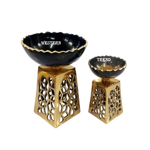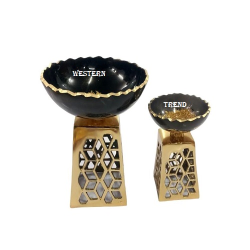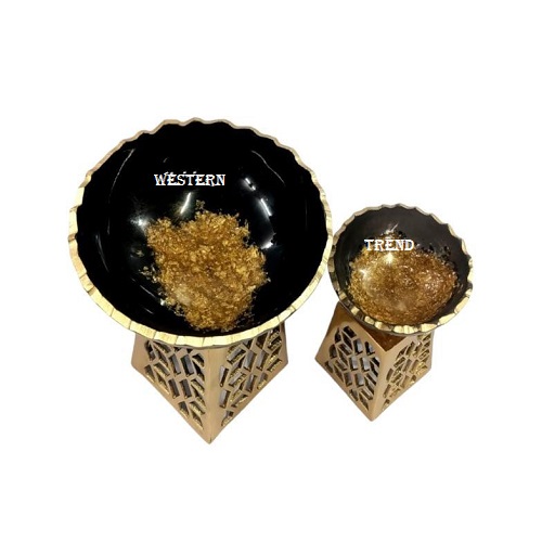 Beautiful modern take on traditional handicrafts. Handmade in India, decorative Black resin bowl with metal Mesh Stand, this bowl can be used for a variety of different purposes from serving cocktails, displaying tabletop, dry fruit, gifting, wedding gifts, simply look perfect its own, Add a touch of natural beauty to your home with the charming resin bowl on metal Stand with Black and Gold finish, the unique and versatile accessory combines the functionality of bowl with the metal Stand, creating an eye-catching pieces that effortlessly enhance your decor, an exquisite Black & Gold color that shines like the crystalline sapphire gemstone, the resin bowl, the resin bowl with its elegant presence on the table is perfect to serve, beautiful resin bowl to fill with potpourri, dried fruit or snacks. Part of the western trend, use for serving, tableware, kitchenware, dinning, made by premium quality, decorative round resin serving bowls on metal stand, design in contrasting shades of gold sparkle enhance a combination of a smooth and surfaces, use for serving this dry fruits bowl creates sculptural elegance with flower cutting edge, the rounded design in contrasting shade of gold finish enhance a combination of a smooth and surfaces, its a table top products, kitchenware products, serving products, use for any occasion, season, festival and wedding, Designer By Western Trend.