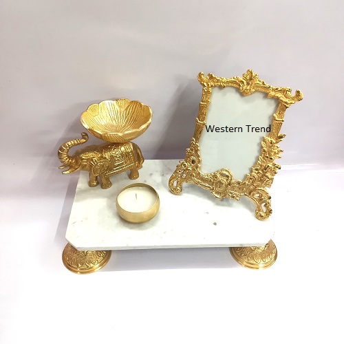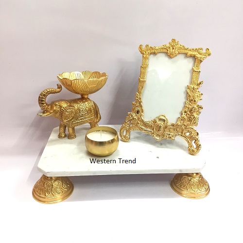Chowki Combo Set with Gold Elephant & Photo Frame and Candle, Marble Chowki Combo Set with Diya and Photo Frame and Elephant, Candle T-Light, Hamper Gifts Set, Combo Set, Pooja Décor