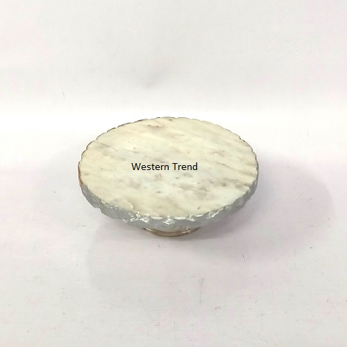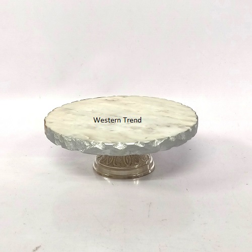 Present Your Cakes in Style With This Rough Edge With Handmade Textured Work With Silver Finish Marble Cake Stand, Premium Marble Top Enhance the visual appeal of your cakes with the classic charm of marble, Round White Marble Cake Stand With Metal Silver Base, Stylish and Sturdy Showcase your Delicious Creations With Grace Metal Stand, Elegant Cake stand, Versatile Display Perfect for Cakes, Pasties, cupcakes, and gifts Birthday gift, Hamper gifts, Wedding gifts, Anniversaries gifts, Festival Gifts, Occasion Gifts, Diwali Gifts, Corporates Gifts, Latest Designer Gifts, Luxury Gifts, Royal Gifts, Exclusive Gifts, Handicrafts Gifts, Table top Products, Beautiful Centerpieces Elevate Your Table Decor With This Eye Catching Cake Stand, The Cake Stand are professionally crafted in high quality marble to make the tables sturdy and durable to stand the test of time its Designed By Western Trend