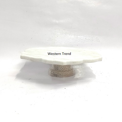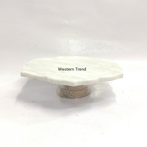 Shaped White Marble Cake Stand With Metal Silver Base, Stylish and Sturdy