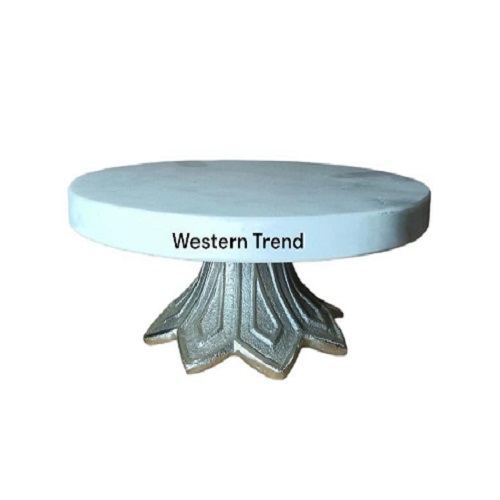 Pretty Marble Cake Stand With Metal Lotus Shape Base With Silver Finish, Decorative Metal Tier Cake Stand Dessert Table Decoration Display With Marble Design Tray With Metal Stand, Pedestal, Cupcake, Buy Best Quality Use For Home Hotels,
