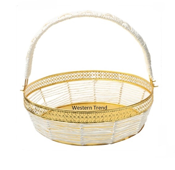 Beautiful Wire Basket with rope weaving latest pattern, you can carry easily and place it in any places you like. Applicable to patio, garden, balcony, living room, bedroom, hallway, etc. Handmade wire basket, made of natural material, eco-friendly and durable Round Iron Wire Hamper Basket Gifts hamper baskets, decorative storage baskets This Decorative Gold Metal Hamper Basket, handicrafts basket, wire baskets, fruits baskets, hamper baskets, A multipurpose product useful for storing fruits, vegetables, A perfect gifts item for your friends, relatives on any occasion, Wedding Gifts, Anniversary gifts, Festival gifts, Diwali gifts, Hamper gifts, corporate gifts, house warming gifts, bespoke gifts, handmade gifts, handicrafts gifts, customized gifts, Attractive Basket for Decor Home, party, gifting, any occasion and festival Designed by Western Trend