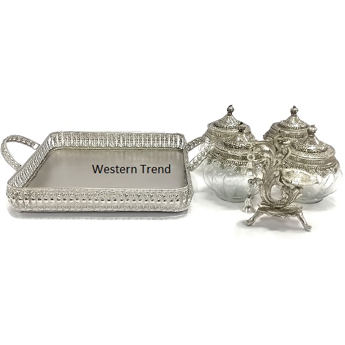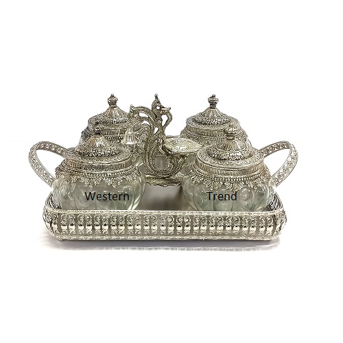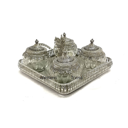 Glass Dry Fruits bowl that comes with a metal lid, The product is made Glass & aluminum and has a German silver antique finishing. This can also go as a amazing wedding, Festival and any occasion gift. Complete Set: This set boasts a total of 6 exquisite pieces from Western Trend, including 1 Silver Tray, 4 Jars and 1 Deepak Bell, Enamel Lacquer with Silver Antique Finish, adding a touch of luxury and sophistication to your table setting or home decor. Elegant Silver Tray: The centerpiece of this set is the elegant Silver Tray radiating timeless charm and opulence. Luxurious Look: With their lavish design and impeccable finish, these pieces exude a sense of luxury, elevating any dining experience or home ambiance, Best products for gifting Wedding gifts, Hamper Gifts, Festival Gifts, Special Gifts, Diwali Gifts, Birthday Gifts, Anniversary Gifts, Corporate Gifts, Housewarming Gifts, Handicrafts Gifts, Designed By Western Trend.