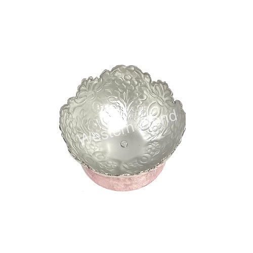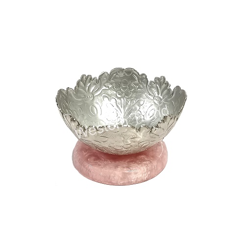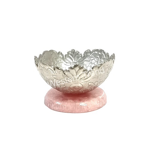 This decorative silver plated bowl with a pink resin base lends an