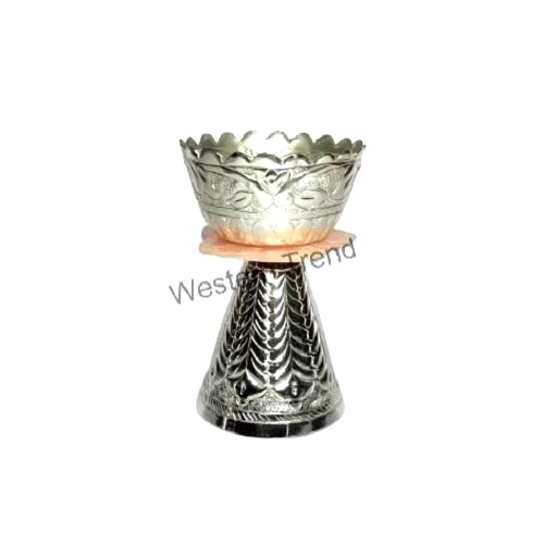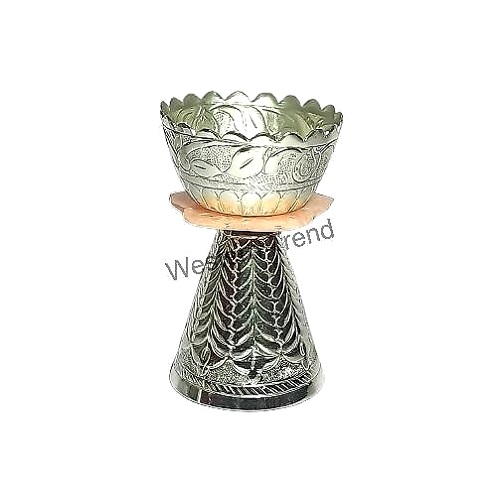 Our exquisite Emerald Pink Lotus Diya Stand is a symbol of purity, divinity, and enlightenment. This meticulously crafted Diya is not only a source of radiant light but also a stunning piece of art that will enhance the beauty of your sacred space. The Emerald Pink Lotus Diya Stand is designed to perfection, capturing the delicate beauty of the lotus flower and is made from high-quality material. This Diya is not only perfect for your own spiritual practices and ceremonies but also makes a thoughtful gift for loved ones on special occasions such as weddings, housewarmings, or festivals, Diwali.This bowl creates an aura of grandness. The silver plated bowl comes with a pillar stand with a rose quartz accent in middle. It is beautiful and a stand-alone piece. The use of natural stone with metal stand a great finish. It can also be considered as a perfect housewarming gift for your loved ones.Introducing Silver Metal Diya Lamp made of the Premium Material. This exquisite piece of craftsmanship comes from our Metallic Enchantment collection.