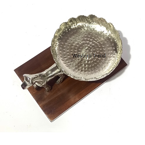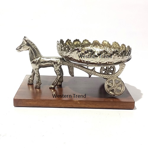 piece is a handcrafted silver-plated horse chariot bowl set on a rich wooden