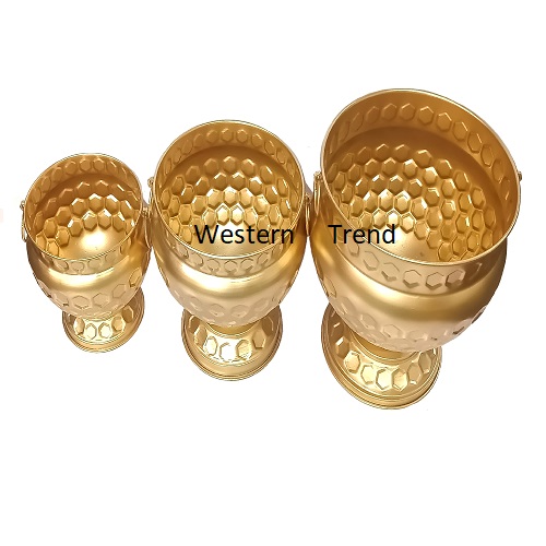 A touch of royalty for your event decor! This exquisite set of gold-finished Planter,Gangalam,URN, Haldi Pots adorned with intricate diamond patterns, brings elegance and grandeur to any setup. Whether used for floral arrangements, or traditional rituals, these urlis create a statement of sophistication. Perfect for weddings, poojas, and festive celebrationsA statement of grandeur and sophisticated taste Gangalam vase with handles is the perfect addition to any home decor. The golden Vase gives it a luxurious look and feel. Ideal for displaying flowers or simply as a standalone decorative piece, this planter will impress guests and elevate the ambiance of any room, Entrance & Wedding Decoration.